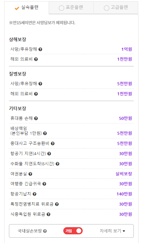 생년월일 및 여행기간 등 간단한 정보를 입력하신 후 보험료 조회하시면 됩니다. 실속플랜 / 표준플랜 / 고급플랜으로 구분이 되어 있으며 보장내역 확인 후 적절한 것을 선택하여 해당 보험사 신청페이지에서 결제를 진행하시면 됩니다.