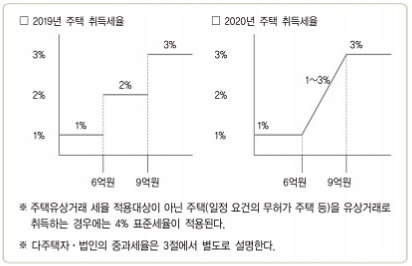 주택을 매매 취득하는 경우 2020년부터 6억 원 ~ 9억 원 구간 세율이 기존 2%에서 1% ~ 3%로 세분화되었습니다.