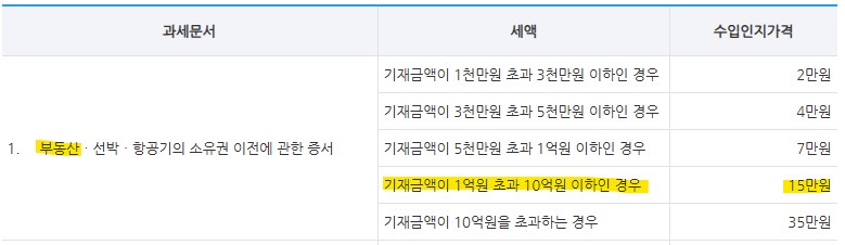 저는 위에 형광펜으로 칠해진 부분에 속해서 15만 원의 수입인지를 구매하였습니다.